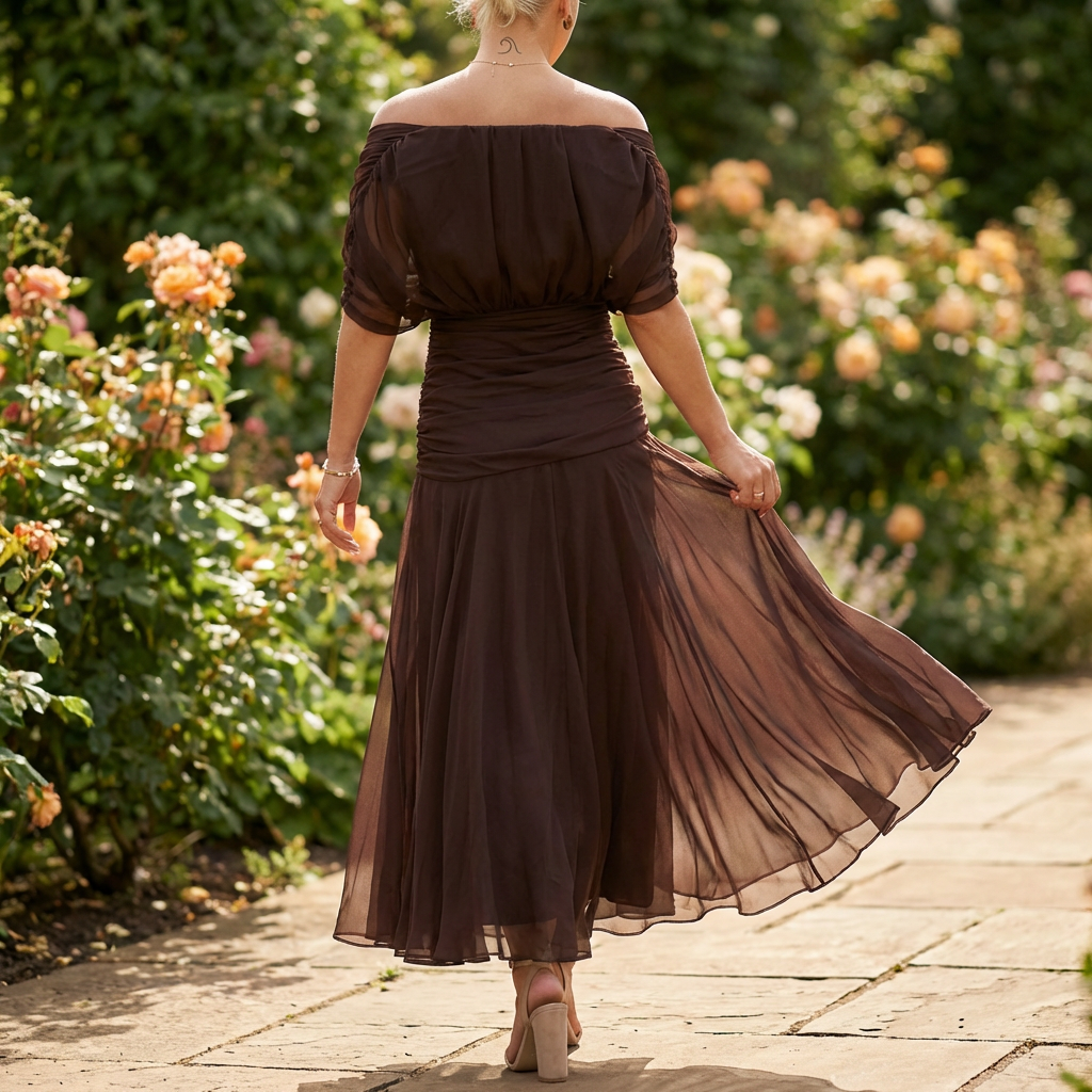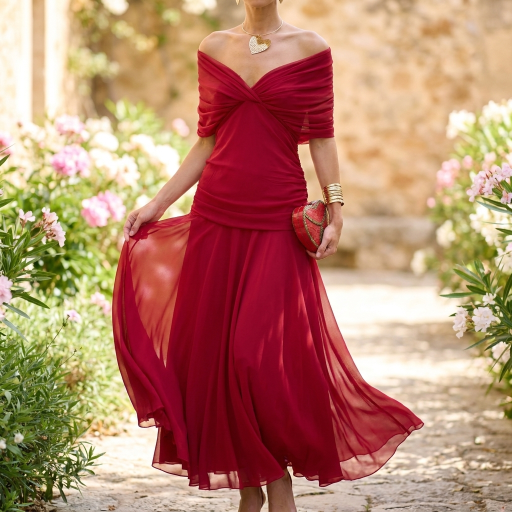 Kjole med Off-Shoulder Design | Draperet Nederdel | Elegant & Figursyet Silhuet
