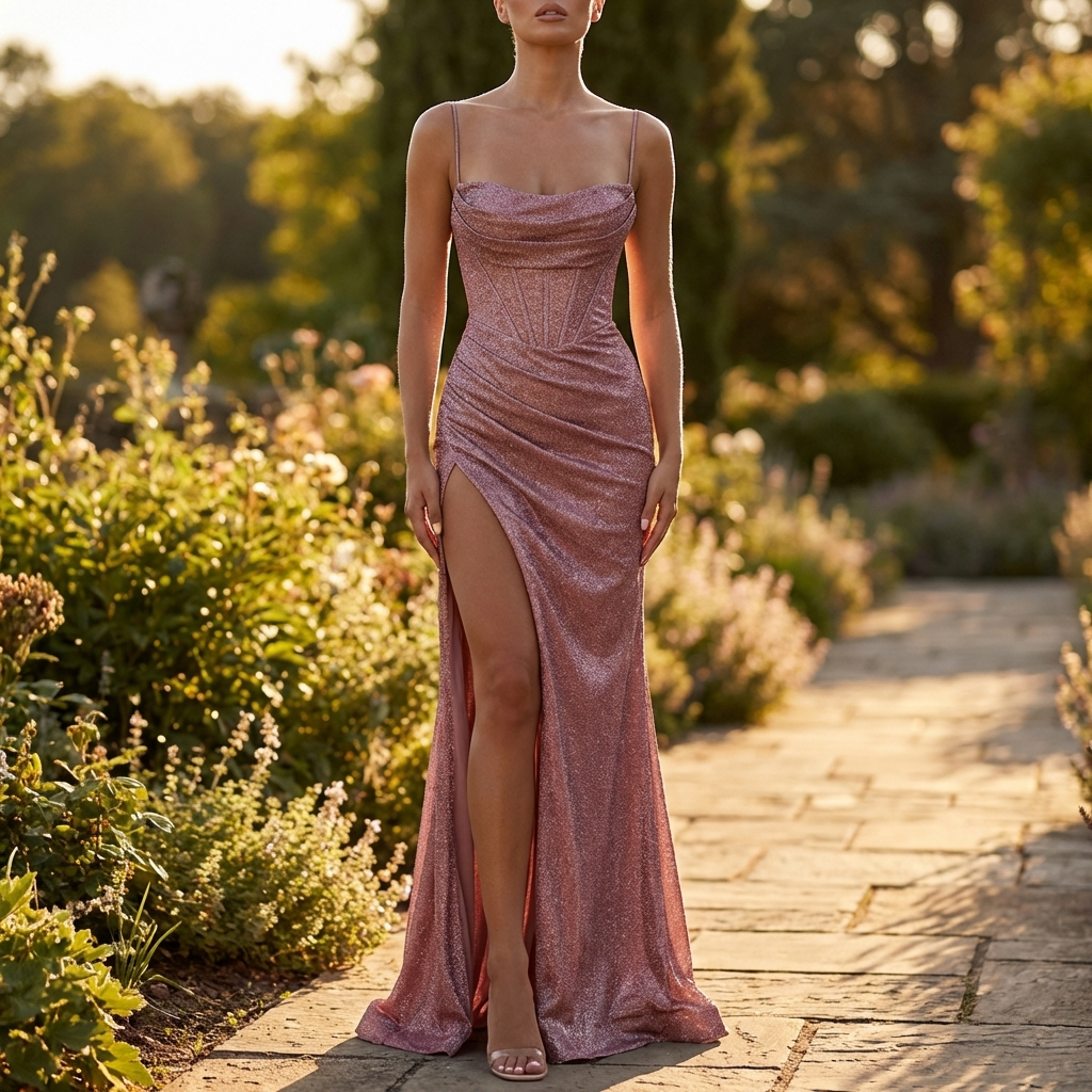 Kjole med Glitrende Finish | Høj Slids | Elegant & Figursyet Aftenlook