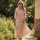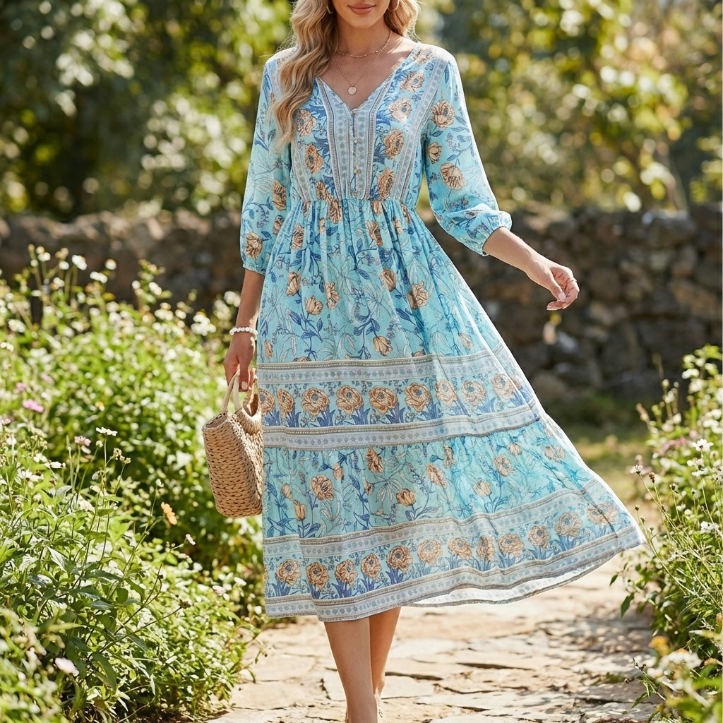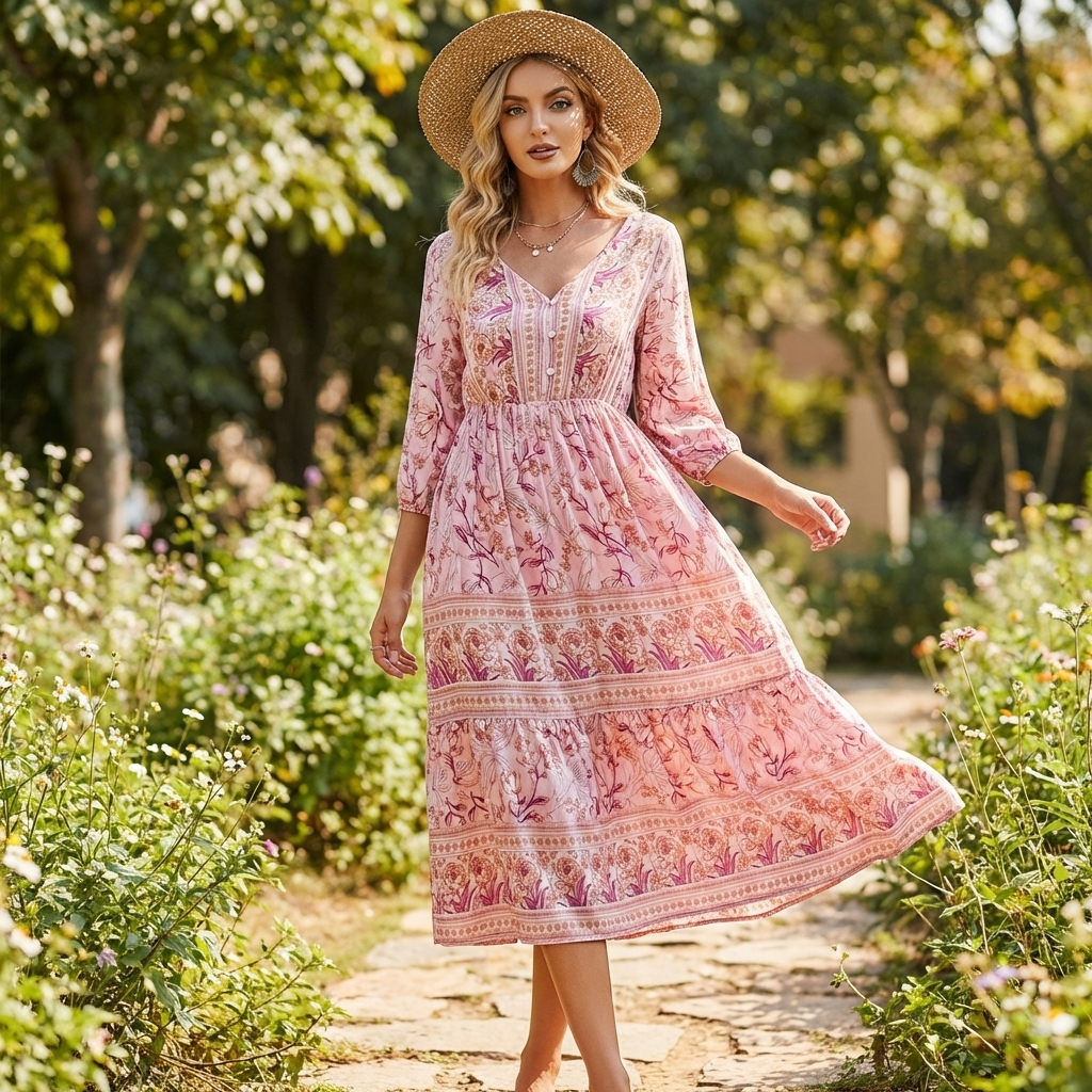 Sommerkjole med Boheme Print | V-Udskæring & Elastisk Talje | Let & Afslappet Stil